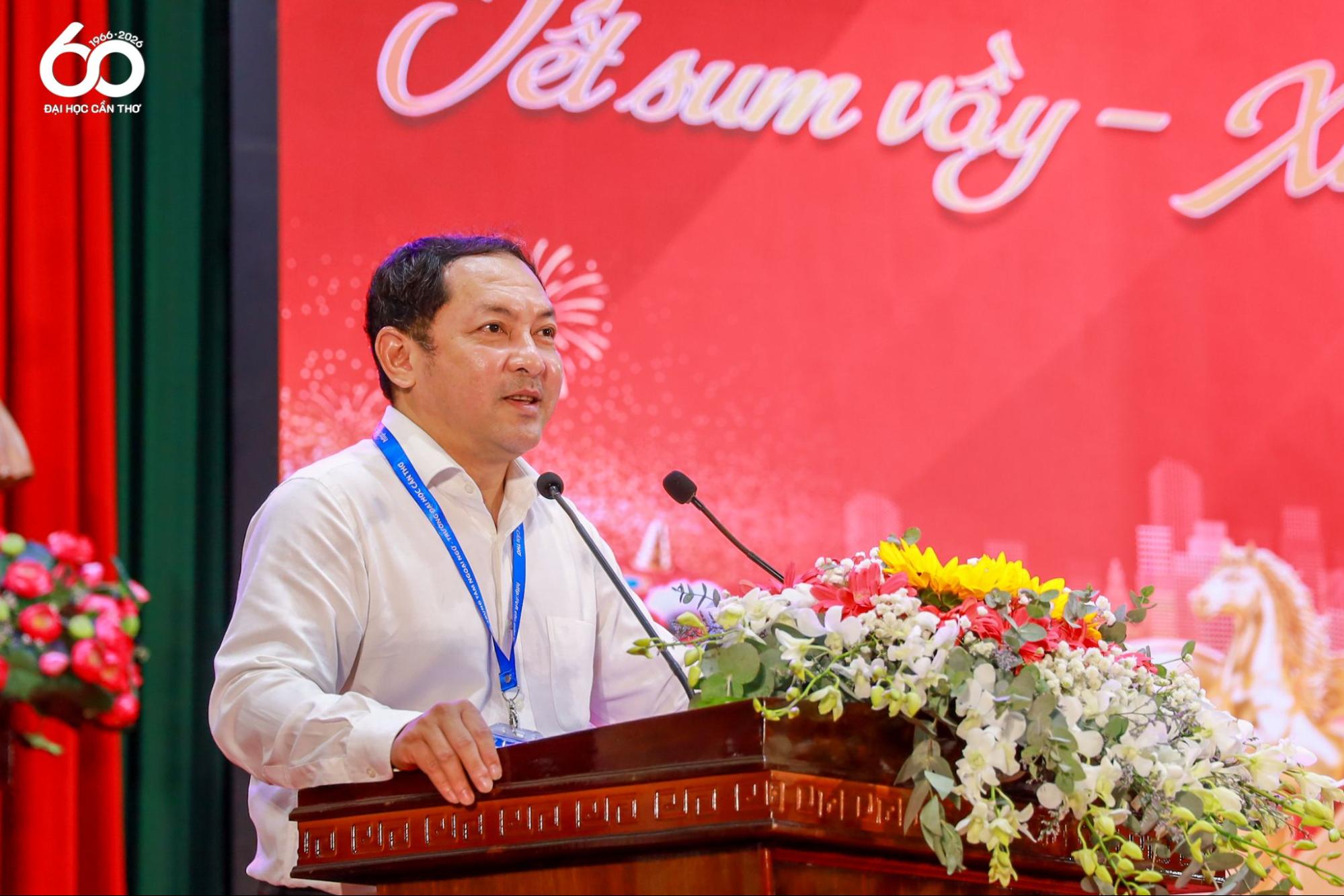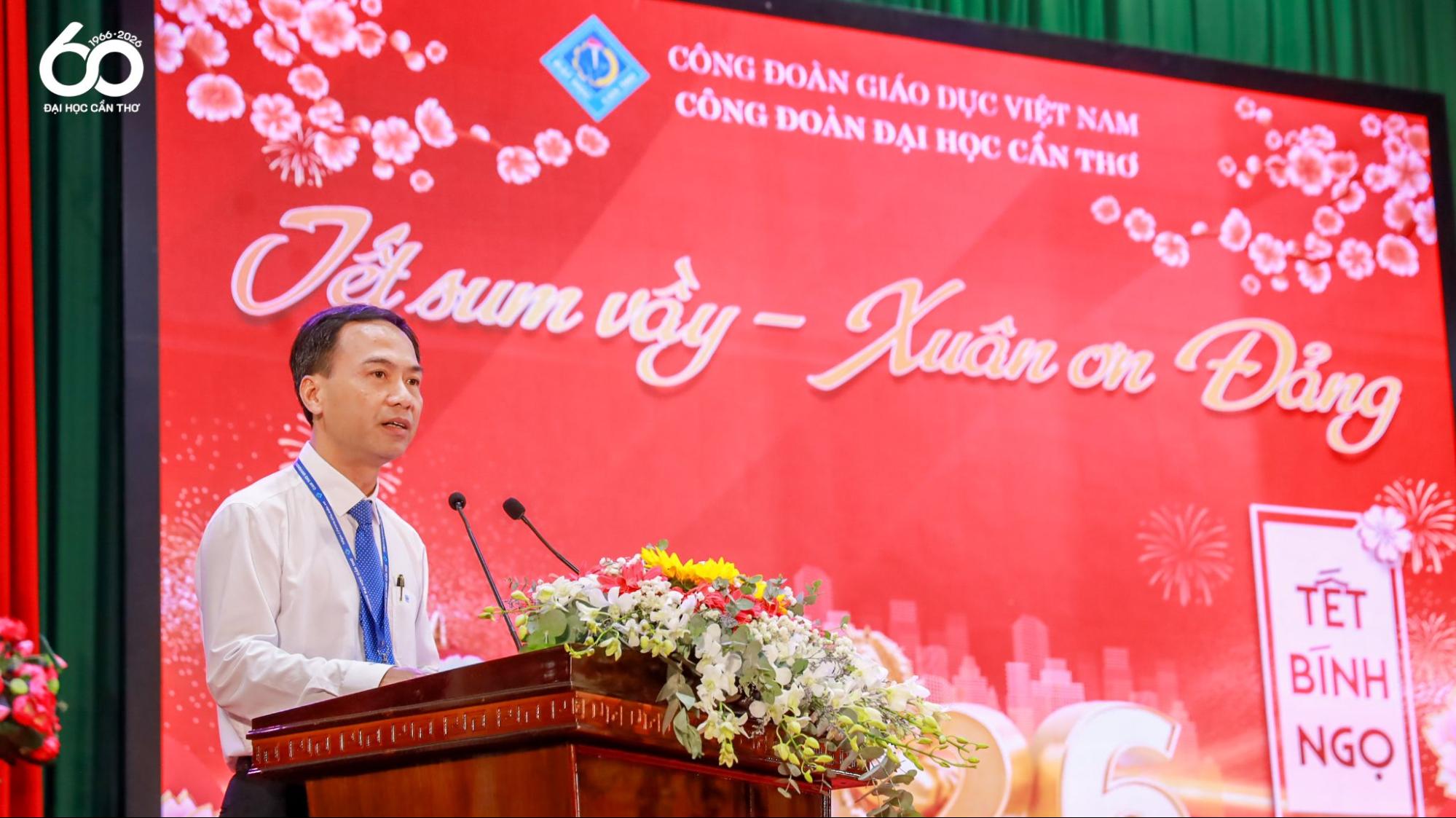 Phát biểu tại chương trình, TS. Lê Văn Lâm nhấn mạnh ý nghĩa nhân văn của chương trình trong việc chăm lo đời sống, lan tỏa tinh thần sẻ chia và gắn kết trong đội ngũ viên chức, người lao động và sinh viên mỗi dịp Tết đến, Xuân về và ghi nhận vai trò của Công đoàn Nhà trường trong công tác chăm lo, hỗ trợ đoàn viên; qua đó khẳng định sự phát triển và uy tín của Nhà trường được xây dựng từ tâm huyết, trí tuệ và sự cống hiến của nhiều thế hệ, hướng tới kỷ niệm 60 năm thành lập và mục tiêu phát triển bền vững gắn với vùng Đồng bằng sông Cửu Long.