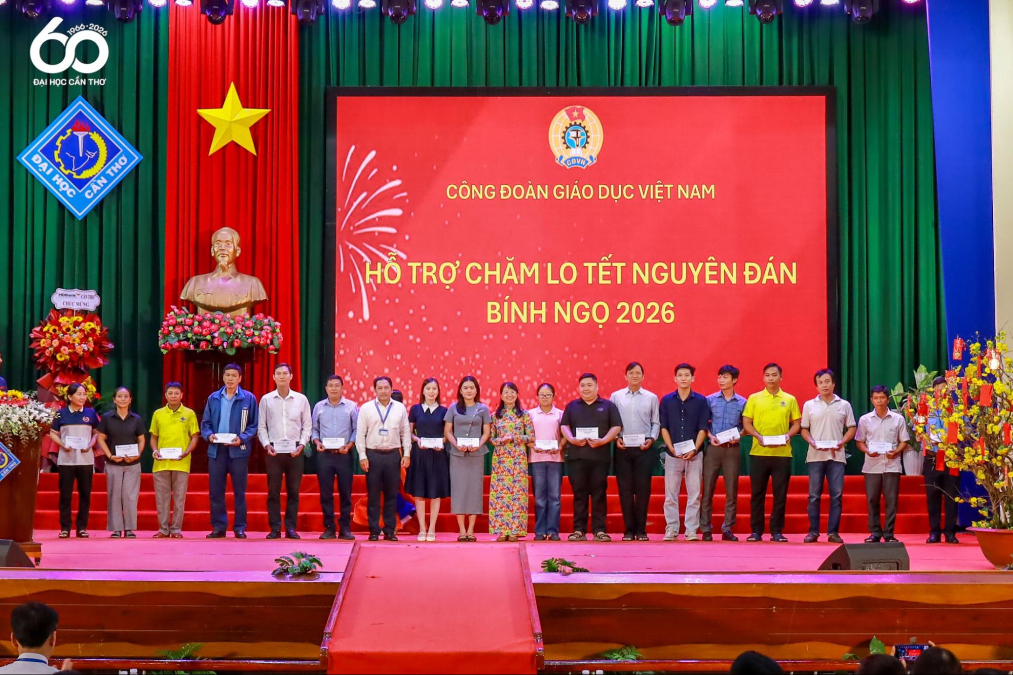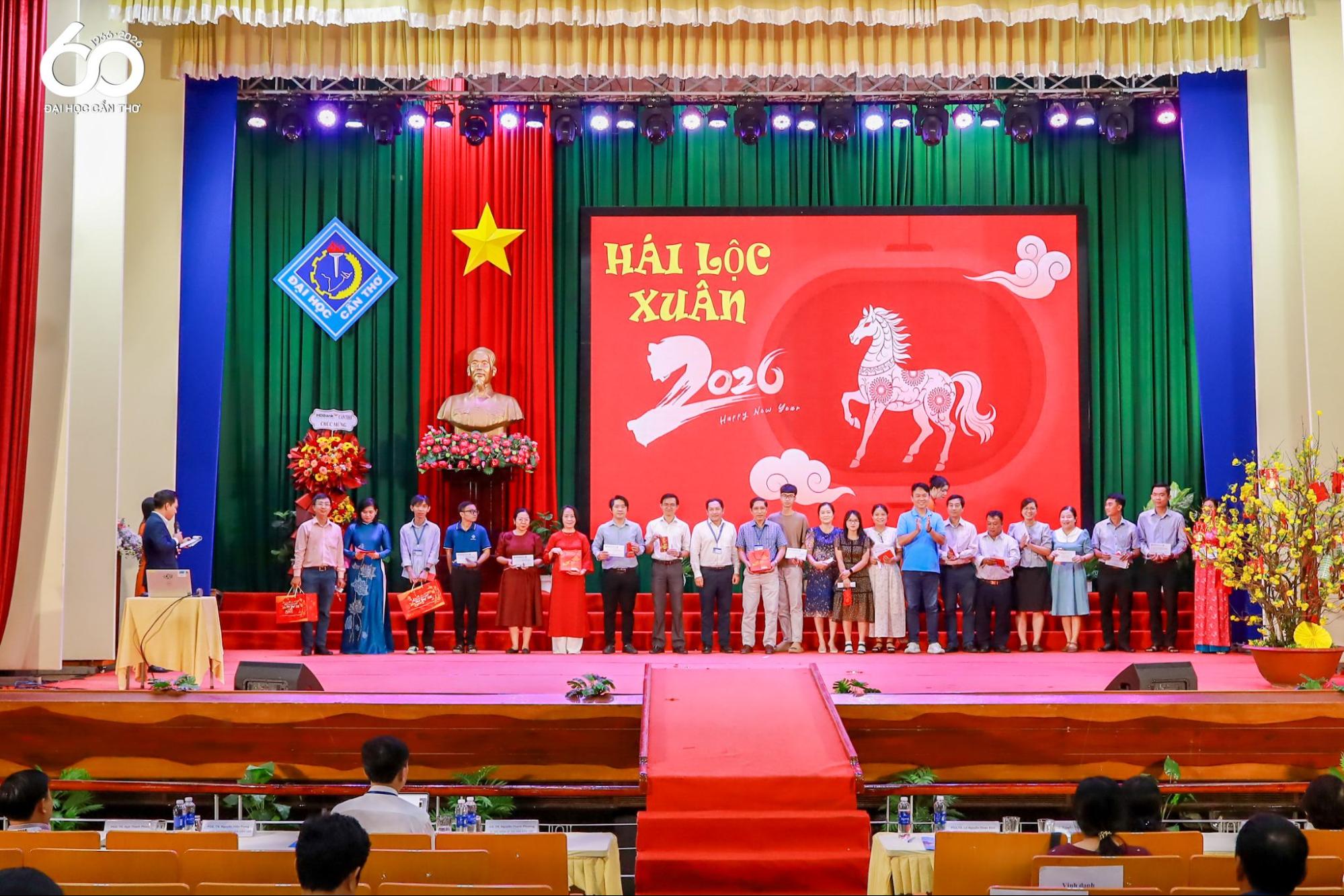 Trong không khí rộn ràng đón Xuân Bính Ngọ, ngày 05/02/2026, Công đoàn Đại học Cần Thơ (ĐHCT) tổ chức chương trình “Tết sum vầy – Xuân ơn Đảng” năm 2026 nhằm chăm lo đời sống vật chất, tinh thần cho đoàn viên công đoàn, viên chức, người lao động; đồng thời lan tỏa tinh thần sẻ chia, hỗ trợ những trường hợp còn khó khăn, góp phần tạo không khí vui Xuân, đón Tết với phương châm “Tất cả đoàn viên, người lao động đều có Tết, vui Tết”.